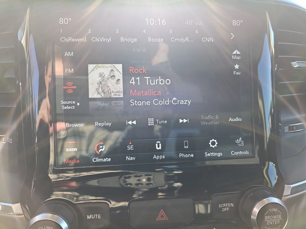 The interior of this Ram 1500 Laramie is a true sanctuary, with premium leather-trimmed bucket seats, heated and ventilated for maximum comfort. The power-adjustable driver and passenger seats, along with the heated steering wheel, allow you to find the perfect driving position.